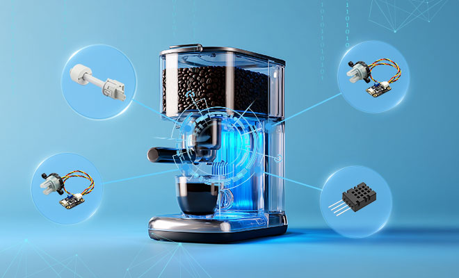 咖啡機智能傳感器及方案,包括流量計量、精準控溫、液位監測與TDS檢測模塊,通過多物理量數據融合與AI算法實時優化萃取參數,構建從水源管理到風味輸出的全鏈路智能控制系統,確保咖啡出品的高度一致性與穩定性。